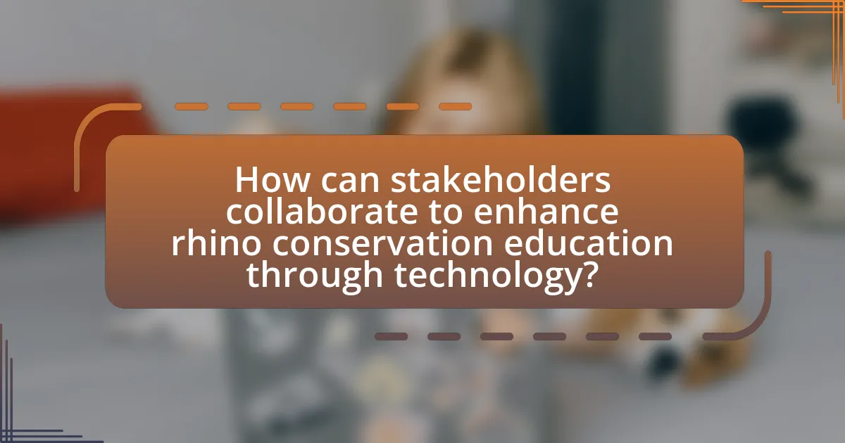 Stakeholders can collaborate to enhance rhino conservation education through technology by developing and sharing digital platforms that provide interactive learning experiences. For instance, conservation organizations, educational institutions, and technology companies can work together to create mobile applications and online courses that educate users about rhino habitats, threats, and conservation efforts. Research indicates that interactive learning tools can significantly improve knowledge retention; a study published in the Journal of Conservation Education found that participants using digital platforms demonstrated a 40% increase in understanding of conservation topics compared to traditional methods. By pooling resources and expertise, stakeholders can ensure that educational content is accessible, engaging, and widely disseminated, ultimately fostering a more informed public committed to rhino conservation.